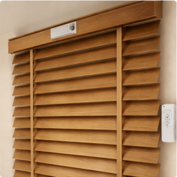 Natūralaus medžio žaliuzės, suteikiančios interjerui struktūros, šilumos ir subtilios estetikos.